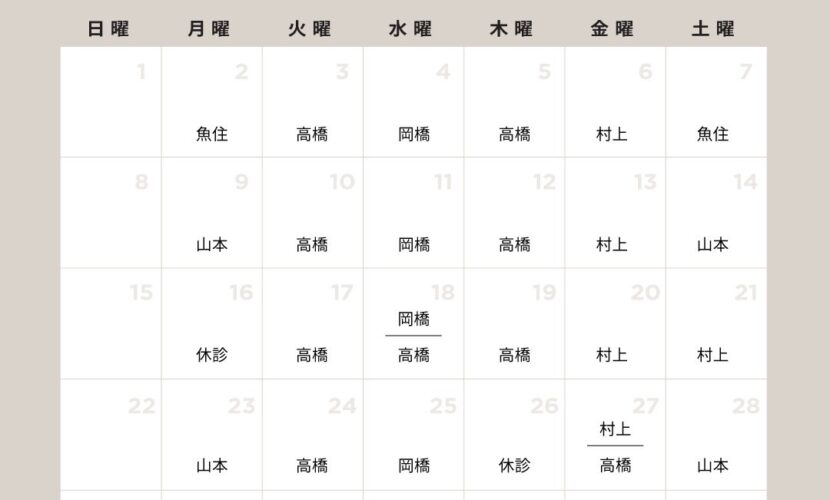カレンダーに記載の高橋統括院長の診療日は新規・既存患者様ご案内となっております。