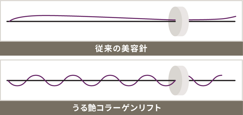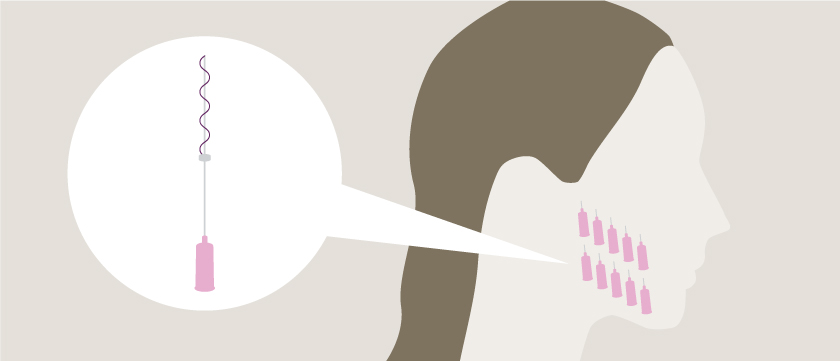 髪の毛よりも更に細い吸収性の糸をお悩みに合わせて数本から数十本単位で真皮内に挿入します。スレッドの挿入により、数か月の過程で効果的なコラーゲン生成が促され、肌のハリ、弾力アップ、タイトニング効果、マイルドなリフトアップ効果が期待できます。