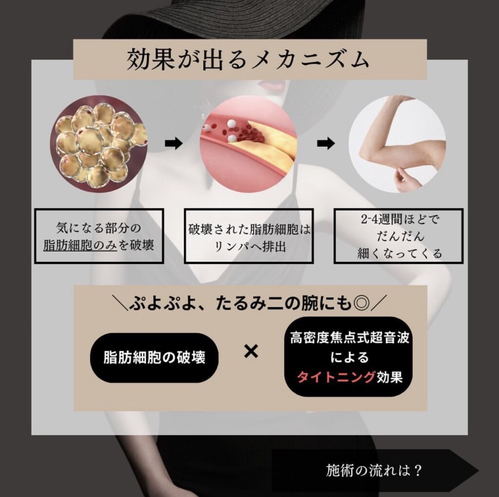 ボディハイフは脂肪細胞の破壊に加え、高密度焦点式超音波によるタイトニング効果もあるため、ぷよぷよ、たるみの二の腕にも効果的です!